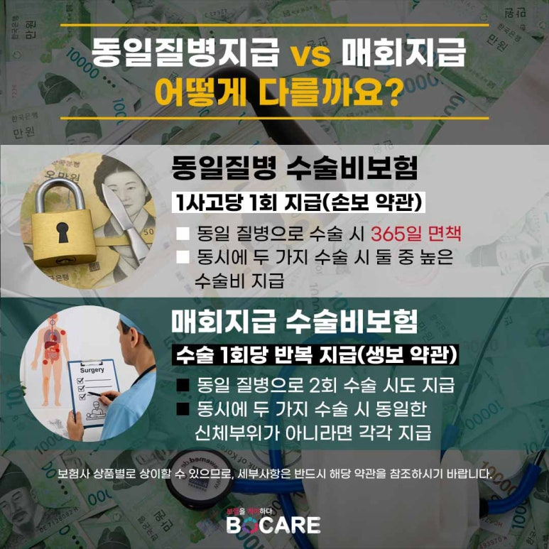재수술 가능성이 있는 질환, 양측 부위 수술 가능성이 있는 경우 매회지급형이 훨씬 유리합니다.